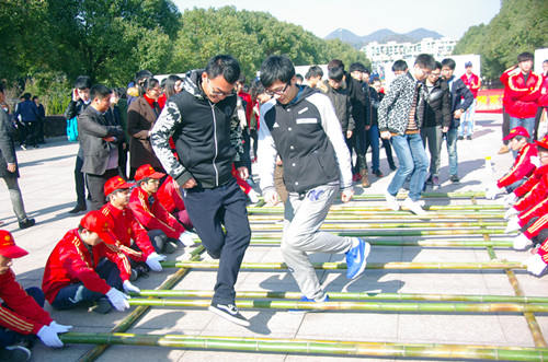 活动首先进行的是“排词语”活动。工作人员将社会主义核心价值观24字打乱排序。20名队员接力,从起点跑向终点进行翻牌,并将打乱的字重新排列成正确顺序。参赛队员鼓足气力,口哨声一响便如离弦的箭一般冲了出去,观众们也是纷纷为自己的代表队加油鼓劲,活动现场热闹非凡。“跳竹竿”比赛则是将现场气氛带向了高潮,随着竹竿声的节奏响起,各系代表队手持喇叭,嘴中喊着“富强、民主、文明、和谐……”24个字口号,脚下有节奏地踩着竹竿奔向终点。最终,会计系技压群雄,获得第一,计信系与贸易系分获二、三名。