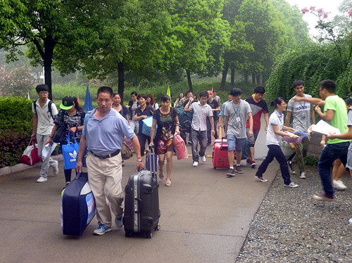 “笑脸喜迎新同学,热情拥抱新伙伴”。2013年9月12日,浙江长征职业技术学院13级新生从全国各地陆续到校报到。团委、学生会、社联及各系学生会干部共同参与到此次迎新活动中。图书馆前的各系报到处,热火朝天地忙着新生的接待注册。虽然下着小雨,迎新志愿者们却丝毫不减热情,不辞辛苦地往返于学院正门、行政楼、寝室三处搬送行李,并全程协助新生和家长办理报到手续。