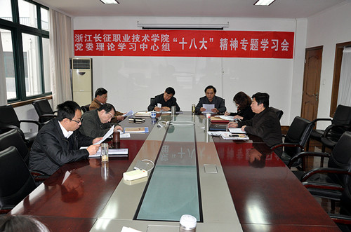 11月23日,浙江长征职业技术学院党委理论学习中心组专题学习党的十八大精神,吕振合、洪永铿、杜宝山、王其军、洪骏、傅建辉、张乐弟等院领导出席了学习活动,党委副书记王其军主持党委理论学习中心组专题学习会。