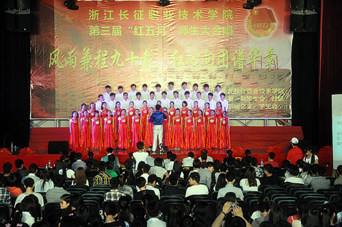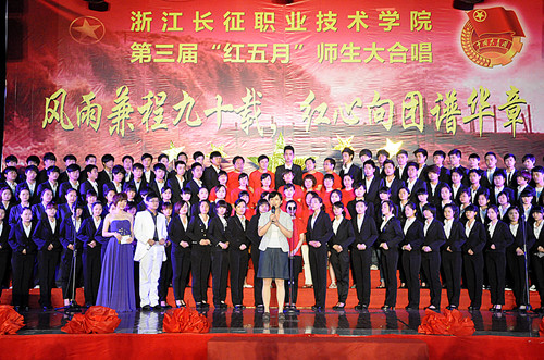 火红五月,激情飞扬。5月9日下午2:00,为庆祝共青团建团九十周年,浙江长征职业技术学院以“风雨兼程九十载,红心向团谱华章”为主题的第三届“红五月”师生大合唱在院体育馆隆重举行。