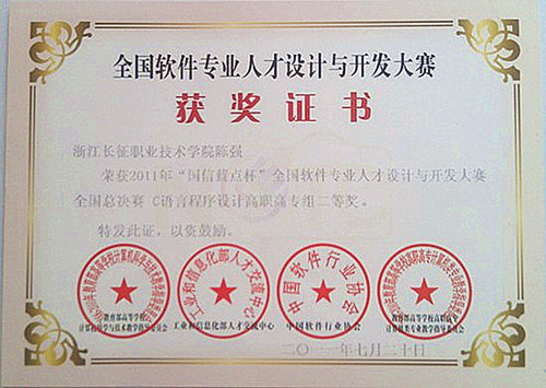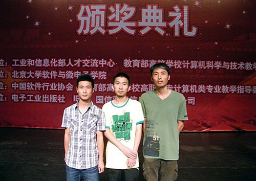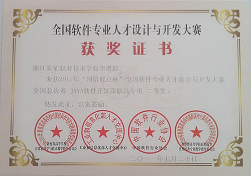 2011年7月14日第二届“国信蓝点杯”全国软件专业人才设计与开发大赛总决赛在北京大学计算机学院中心机房拉开帷幕。经过近四个小时的角逐,我院计算机与信息技术系的李遵源、陈强同学分别获得Java(高职类)、C语言(高职类)二等奖。同时他们还获得免笔试直接进入东软、亚信联创、神州数码、腾讯、华为等知名软件企业的面试机会。指导老师黄华、吴少俊获全国软件专业人才设计大赛优秀指导老师荣誉称号。全国软件专业人才设计与开发大赛由工业和信息化部人才交流中心、教育部高等学校计算机科学与技术教学指导委员会主办。大赛在全国28个省市设立了分赛区,共65个赛点,吸引了700多所院校的近万名选手参加。是全国目前规模最大,水平最高,人数最多,影响力最大的软件比赛。经过层层选拔,来自北京航空航天大学、浙江大学、中山大学等352所院校的900余名选手代表参加了总决赛。