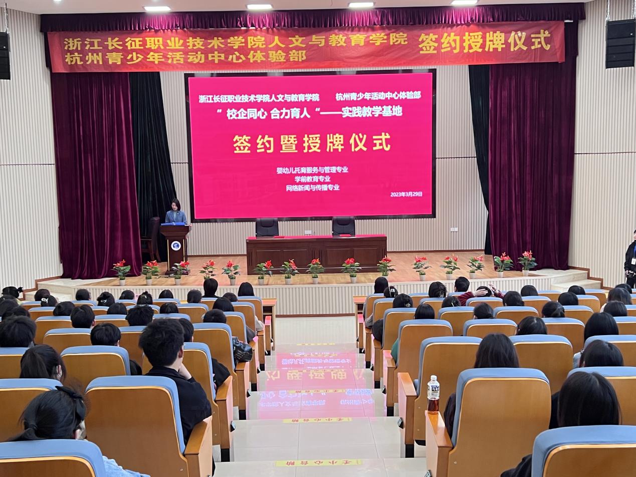 为进一步提高浙江长征职业技术学院婴幼儿托育服务与管理专业、学前教育、网络新闻与传播专业人才培养质量,推动职业高等教育与实训企业协同发展的探索实践、打造“校企联合育人”的人才培养路径、提升学生综合教育教学实践能力。3月29日下午,浙江长征职业技术学院人文与教育学院与杭州青少年活动中心体验部签约共建校企合作实践基地,基地签约授牌仪式在浙江长征职业技术学院第二报告厅隆重举行。