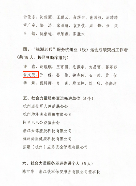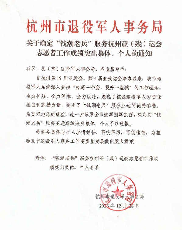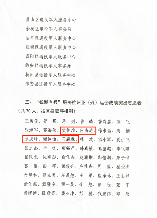 亚(残)运会举办期间,我校与西湖区退役军人事务局共组织24名“钱潮老兵”亚运志愿者,全力保障浙江大学紫金港校区体育馆、浙江工业大学屏峰校区板球馆、淳安界首体育中心场馆和千岛湖淳安会场的赛事医疗协转工作。志愿者们的优异表现得到了亚组委和社会各界人士的一致好评,体现出学校在大学生退役士兵管理和培养方面的先进性。