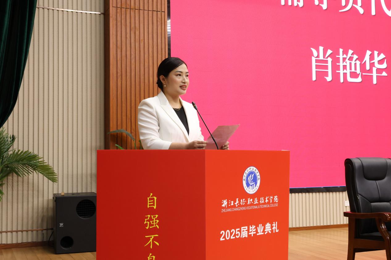 教师代表沈丹在发言中,表达了对毕业生的祝福与期待。她表示:大学三年,见证了全体同学的成长与进步,希望全体同学保持学习之心、坚守初心使命、勇于担当,做一个有责任感的人。
