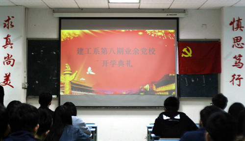 2016年3月28日晚18时30分,建工系在教学楼1503教室举行了第八期业余党校开学典礼。出席本次开学仪式的有系党总支副书记胡雯老师,辅导员章剑飞老师,全体班主任老师及我系第八期业余党校的学员。