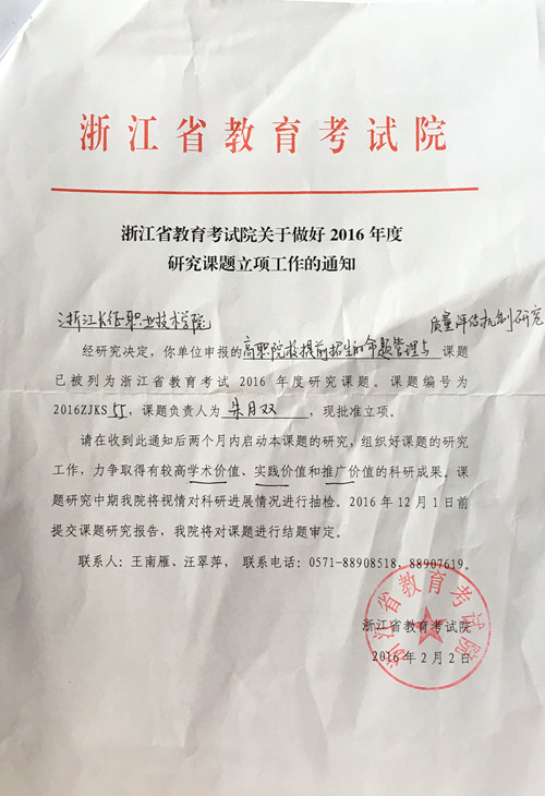 我院教务处朱月双老师主持、教务处及有关系部老师参加的《高职院校提前招生的命题管理与质量评估机制研究》课题获得浙江省教育考试院2016年度研究课题立项,课题编号2016ZJKS55,,该研究将促进高职院校提前招生的命题管理与质量评估工作,望认真做好开题,按时保质保量完成研究任务。