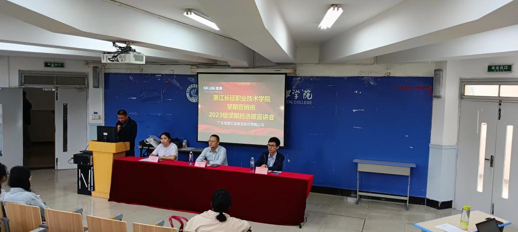 为积极推行以就业为导向的人才培养模式,不断深化校企交流合作,更有针对性地为用人单位输送高素质应用技术型人才,近日,广东坚朗五金制品有限公司人资部部长戴成一行2人来我校洽谈校企合作事宜并举办2023级坚朗营销班选拔宣讲会,学校商务与贸易学院院长王珍、副院长陈露等人参加座谈。