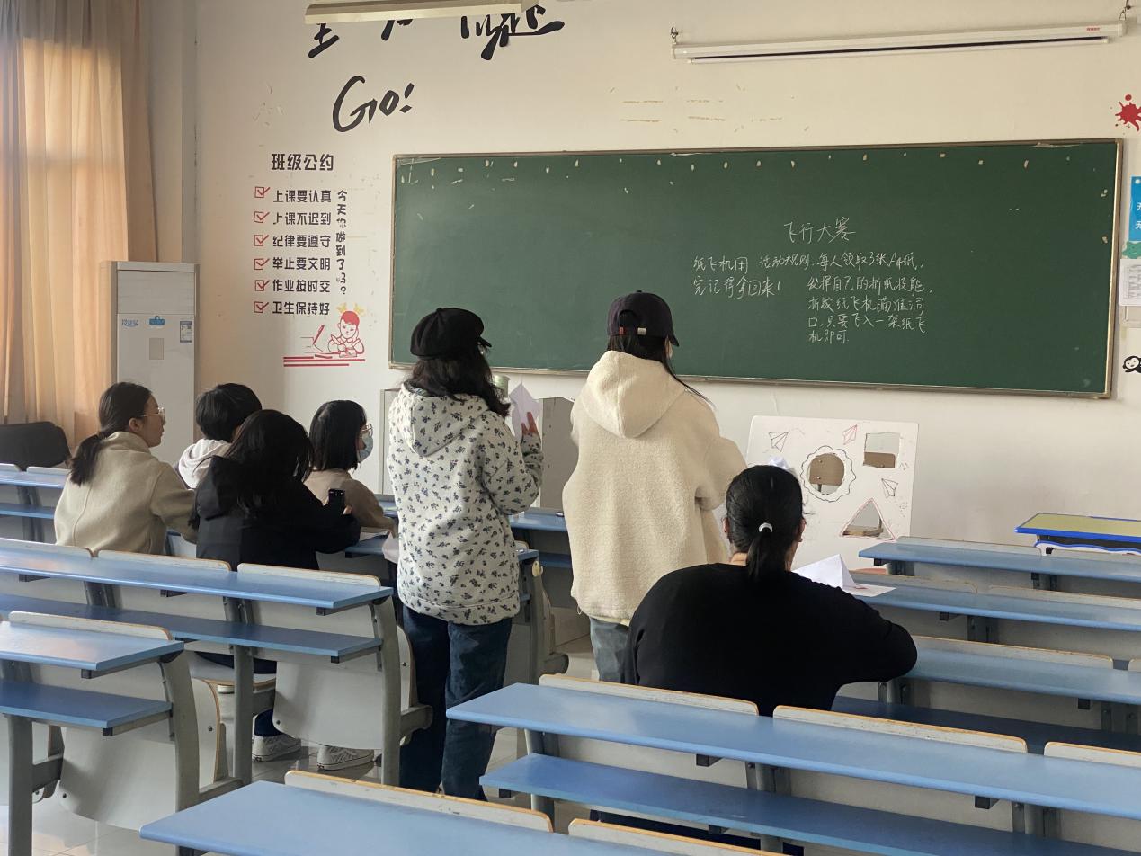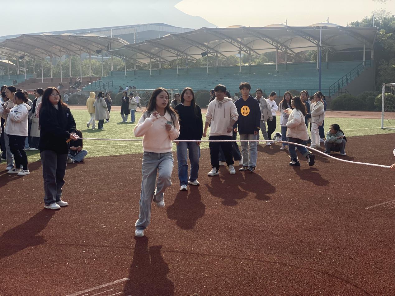活动现场欢声笑语此起彼伏。在交换心情盲盒的游戏中,同学们在便签纸上认真地写下自己的祝福并放入盲盒;在绕口令游戏中,同学们围在一起磨炼嘴皮子,互相加油打气。在跳长绳游戏和两人三足等集体游戏中,同学们相互扶持,携手前进,跨越了一个又一个障碍,展现了高度的团队精神。
