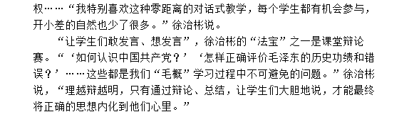 他坚持每天按时收看中央电视台《新闻联播》和浙江卫视《浙江新闻联播》节目,将与课程教学密切相关的内容及时充实到教学内容中去,使学生既能在第一时间了解党中央的最新精神、理论创新的成果和国内外大事,又能了解浙江省委的重大工作部署、浙江的发展成就和基本经验。通过让学生感知浙江中国特色社会主义的成功实践来不断增强中国特色社会主义的道路自信、理论自信、制度自信和文化自信,这是徐治彬老师教学内容改革与课程开发改革的重要着力点和创新点。